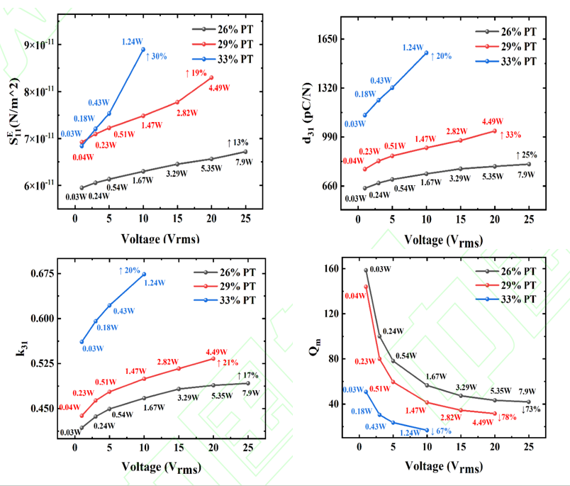实验结果:结果表明,PT含量的增加显著改变了压电材料的性能,导致相变。PT含量为26%的PMN-PT单晶在8W功率激励下,压电系数增加25%,柔顺系数增加12%,机电耦合系数增加17%,机械品质因数降低73%。PT含量为29%的PMN-PT单晶在4.49W功率激励下,压电系数增加33%,柔顺系数增加20%,机电耦合系数增加21%,机械品质因数降低78%。PT含量为33%的PMN-PT单晶在1.24W功率激励下,压电系数增加20%,柔顺系数增加30%,机电耦合系数增加20%,机械品质因数降低55%。这些结果表明,较高的PT含量使PMN-PT单晶在大功率应用中对温度效应更敏感,从而降低了功率耐受性,增加了退极化的风险。本研究首次详细阐述了不同PT含量的PMN-PT单晶在大功率应用中的性能,与以往研究有显著差异,填补了文献中的空白。