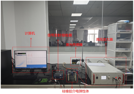 实验过程:使用计算机编辑任意波形由函数发生器输出,信号通过高压放大器放大至2kVp-10kVp,驱动硅橡胶(介电弹性体)材料伸缩运动。用激光传感器捕捉材料伸缩运动幅度的波形,将运动波形通过导线输出到计算机,通过计算机软件可以观察到信号输入波形和伸缩运动幅度的波形,两组进行数据对比。可以观察到材料有明显的周期性伸张和收缩,在计算机上可以观察到输出波形和伸缩运动幅度波形,两者完全一致。