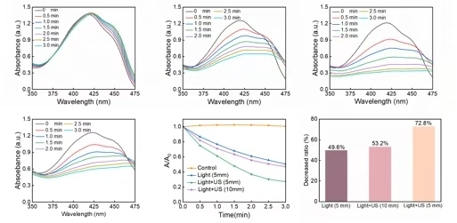 3、环境干扰控制与数据采集:在自然环境中(无激光照射)记录吸光度基线数据,排除环境因素干扰?。使用分光光度计对四种实验条件(无激光光照、正常光照、超声作用下5mm/10mm散射仿体)下的DPBF发射光谱(0-3min)进行定量分析?。