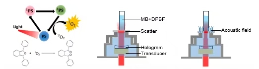 2、声场调控的增效机制验证?:声场产生的声辐射力作用在散射介质上,使得散射光发生聚焦,从而使MB吸收的光能增加,单线态氧产率较对照组增加25.7%(5mm散射介质)?。在10mm厚散射介质中,声场调控仍能维持54.2%的吸光度下降率,证明其穿透深度提高了一倍。