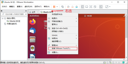 接下来安装VMware Tools,如果不安装该工具,在Windows主机和虚拟机之间无法使用复制粘贴、文件拖拽。首先右击VMware导航栏上的“虚拟机”,然后在下拉框中点击“安装VMware Tools”: