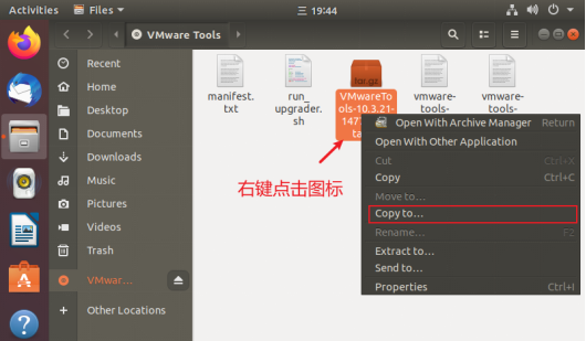 按键盘【Ctrl+Alt+T】调出终端命令界面,使用tar命令对VMwareTools安装包解压