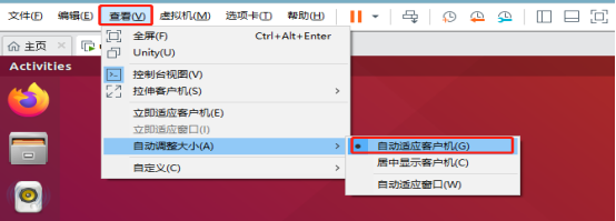 VMware tools工具完成后,可以实现Windows和ubuntu之间的文件复制粘贴,虚拟机自适应全显等功能。如果虚拟机不能够全屏显示,可以通过点击查看,选择自动调整大小,点击自动适应客户机,即可实现虚拟机的全屏显示,VMware tools安装成功。