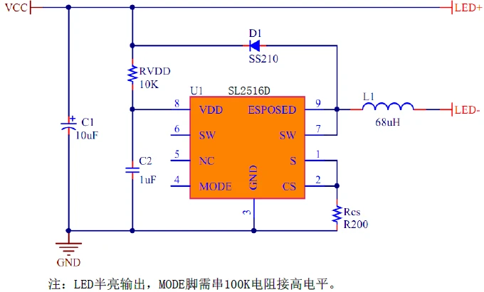 SL2516D 通过对MODE端口进行控制实现二功能切换。MODE悬空时为高亮模式,MODE接高电平时为低亮模式,其中低亮电流为高亮电流的50%。