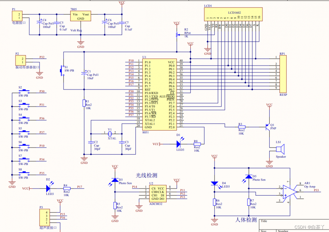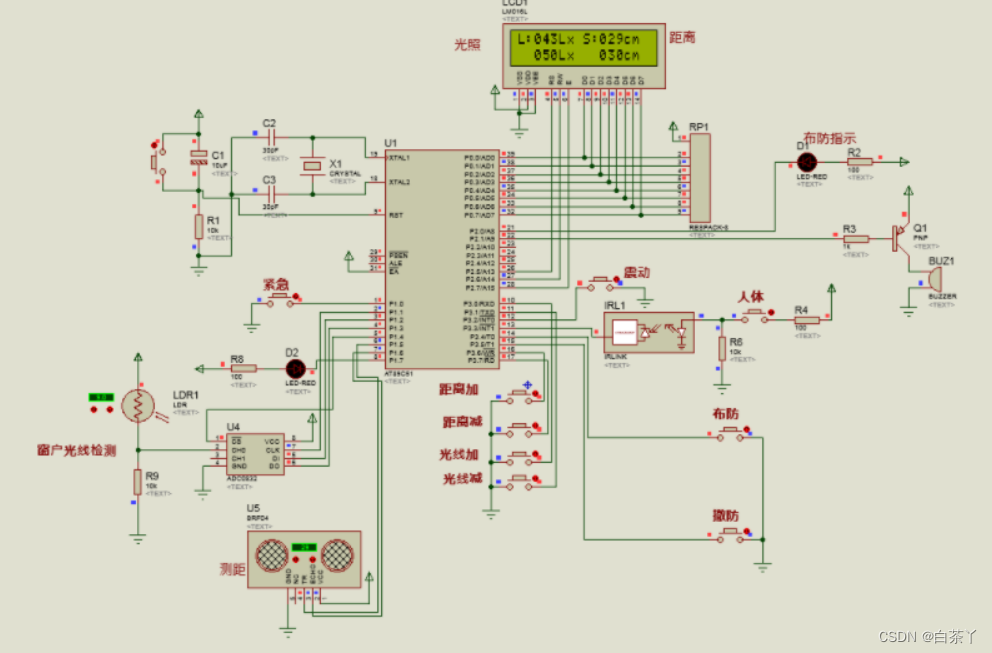 基于51单片机的防盗报警器【人体,距离,光线,振动,紧急】(仿真)