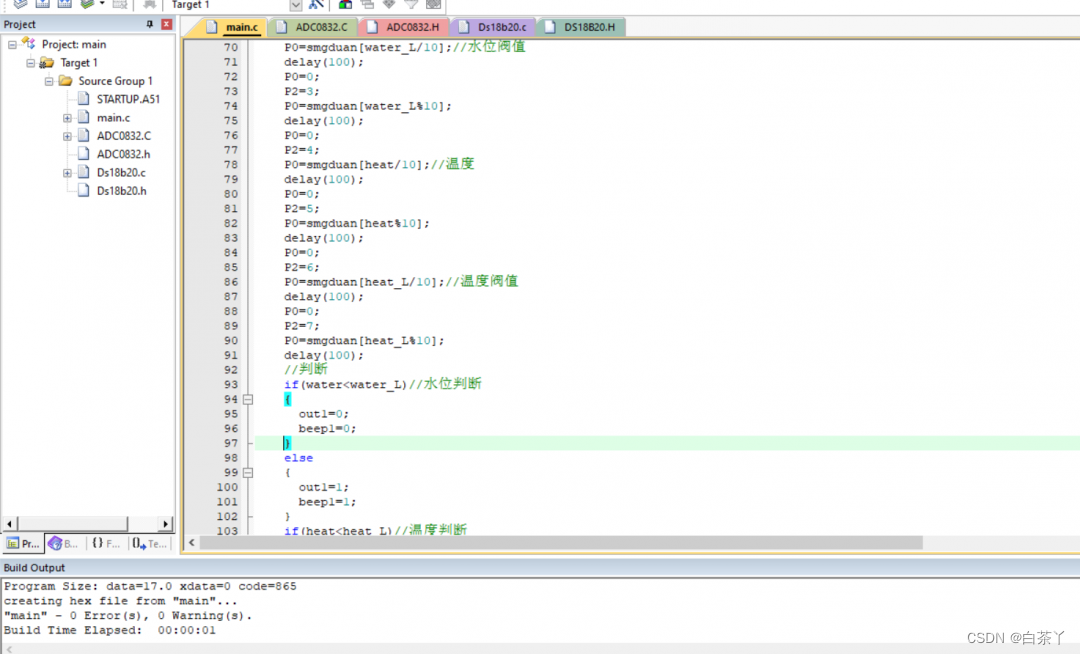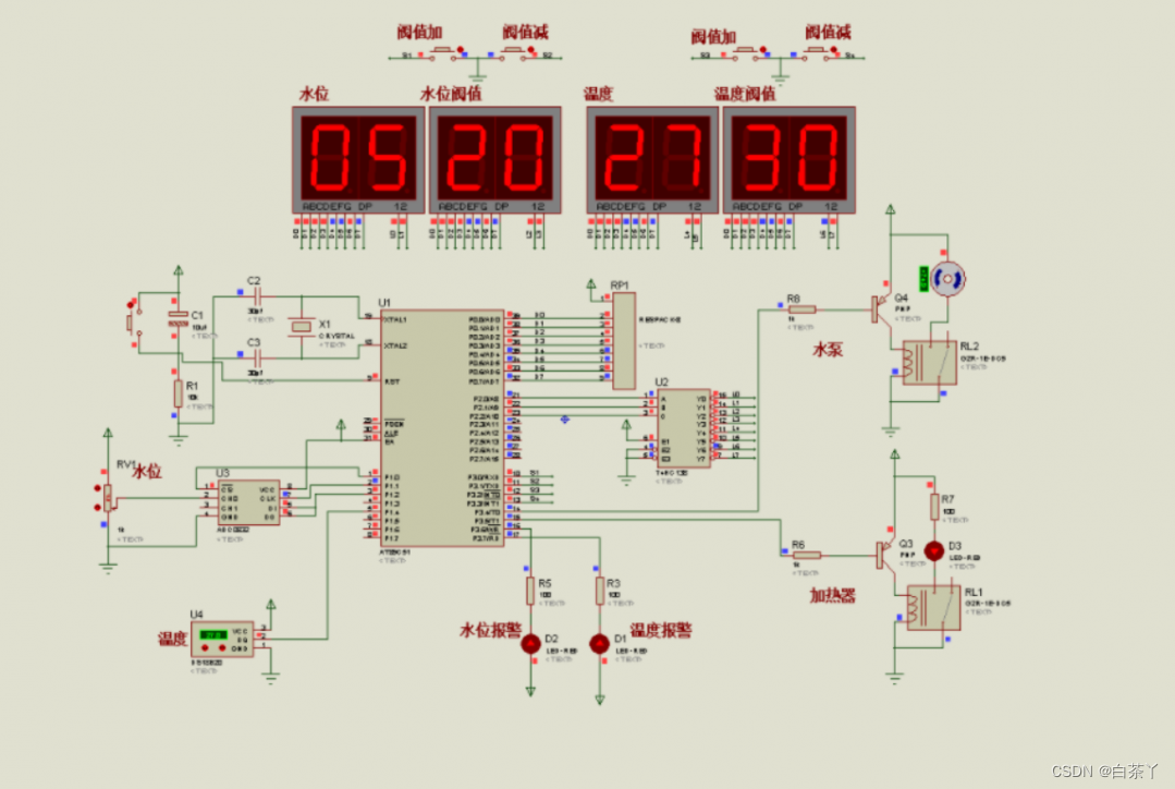 1、当水位低于设定值时,指示灯点亮,单片机发出命令控制水泵加水。