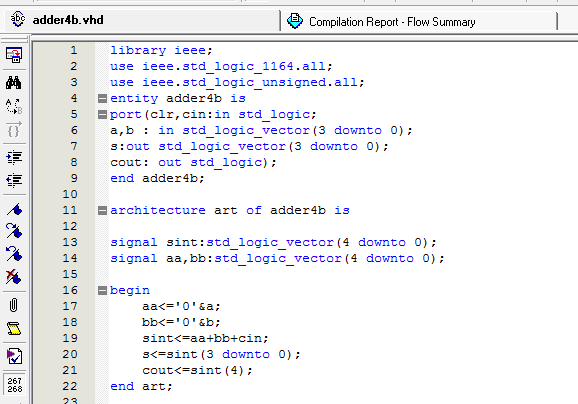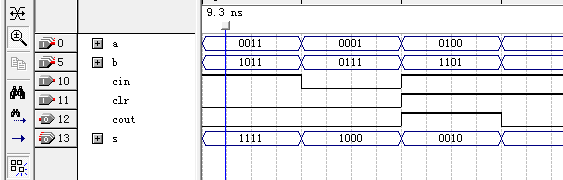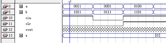 library?ieee; use?ieee.std_logic_1164.all; use?ieee.std_logic_unsigned.all; entity?adder4b?is port(clr,cin:in?std_logic; a,b?:?in?std_logic_vector(3?downto?0); s:out?std_logic_vector(3?downto?0); cout:?out?std_logic); end?adder4b; architecture?art?of?adder4b?is signal?sint:std_logic_vector(4?downto?0); signal?aa,bb:std_logic_vector(4?downto?0);