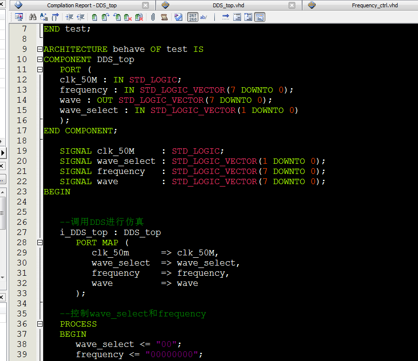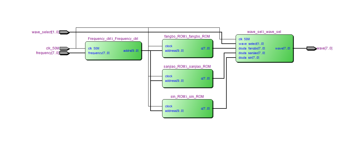 LIBRARY?ieee; ???USE?ieee.std_logic_1164.all; ENTITY?DDS_top?IS ???PORT?( ??????clk_50M??????:?IN?STD_LOGIC; ??????wave_select??:?IN?STD_LOGIC_VECTOR(1?DOWNTO?0);--01输出sin,10输出方波,11输出三角波 ??????frequency????:?IN?STD_LOGIC_VECTOR(7?DOWNTO?0);--频率控制字,控制输出波形频率,值越大,频率越大 ??????wave?????????:?OUT?STD_LOGIC_VECTOR(7?DOWNTO?0)--输出波形 ???); END?DDS_top; ARCHITECTURE?behave?OF?DDS_top?IS --例化模块 ???COMPONENT?wave_sel?IS ??????PORT?( ?????????clk_50M??????:?IN?STD_LOGIC; ?????????wave_select??:?IN?STD_LOGIC_VECTOR(1?DOWNTO?0); ?????????douta_fangbo?:?IN?STD_LOGIC_VECTOR(7?DOWNTO?0); ?????????douta_sanjiao?:?IN?STD_LOGIC_VECTOR(7?DOWNTO?0); ?????????douta_sin????:?IN?STD_LOGIC_VECTOR(7?DOWNTO?0); ?????????wave?????????:?OUT?STD_LOGIC_VECTOR(7?DOWNTO?0) ??????); ???END?COMPONENT; ??? ???COMPONENT?Frequency_ctrl?IS ??????PORT?( ?????????clk_50M??????:?IN?STD_LOGIC; ?????????frequency????:?IN?STD_LOGIC_VECTOR(7?DOWNTO?0); ?????????addra????????:?OUT?STD_LOGIC_VECTOR(9?DOWNTO?0) ??????); ???END?COMPONENT; COMPONENT?sin_ROM?IS PORT ( address:?IN?STD_LOGIC_VECTOR?(9?DOWNTO?0); clock:?IN?STD_LOGIC??:=?'1'; q:?OUT?STD_LOGIC_VECTOR?(7?DOWNTO?0) ); END?COMPONENT; COMPONENT?fangbo_ROM?IS PORT ( address:?IN?STD_LOGIC_VECTOR?(9?DOWNTO?0); clock:?IN?STD_LOGIC??:=?'1'; q:?OUT?STD_LOGIC_VECTOR?(7?DOWNTO?0) ); END?COMPONENT; COMPONENT?sanjiao_ROM?IS PORT ( address:?IN?STD_LOGIC_VECTOR?(9?DOWNTO?0); clock:?IN?STD_LOGIC??:=?'1'; q:?OUT?STD_LOGIC_VECTOR?(7?DOWNTO?0) ); END?COMPONENT; ??? ???SIGNAL?addra?????????:?STD_LOGIC_VECTOR(9?DOWNTO?0); ???SIGNAL?douta_fangbo??:?STD_LOGIC_VECTOR(7?DOWNTO?0); ???SIGNAL?douta_sanjiao?:?STD_LOGIC_VECTOR(7?DOWNTO?0); ???SIGNAL?douta_sin?????:?STD_LOGIC_VECTOR(7?DOWNTO?0);