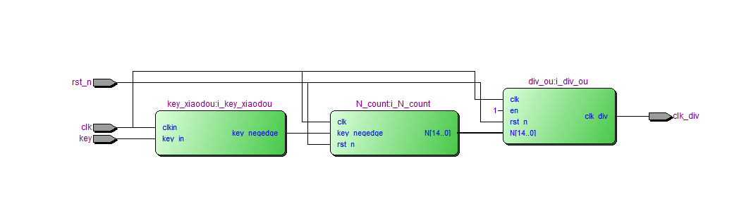 module?div_n( input?clk,//时钟100M input?rst_n,//复位信号 input?key,//分频置数按键 output?clk_div//输出分频信号 ); wire?clk_div_ou;//偶分频信号 wire?clk_div_ji;//奇分频信号 wire?[14:0]?N;//分频倍数 wire?key_negedge; //按键消抖模块 key_xiaodou?i_key_xiaodou( .?clkin(clk),???? .?key_in(key),//输入 .?key_negedge(key_negedge)//消抖后按键下降沿 ); //分频倍数产生模块 N_count?i_N_count( .?clk(clk),//时钟 .?rst_n(rst_n),//复位信号 .?key_negedge(key_negedge),//分频置数按键 .?N(N)//分频倍数 );