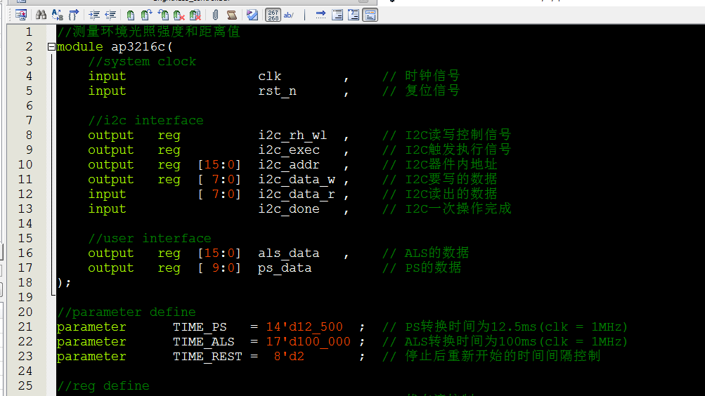 //测量环境光照强度和距离值 module?ap3216c( ????//system?clock ????input?????????????????clk????????,????//?时钟信号 ????input?????????????????rst_n??????,????//?复位信号 ????//i2c?interface ????output???reg??????????i2c_rh_wl??,????//?I2C读写控制信号 ????output???reg??????????i2c_exec???,????//?I2C触发执行信号 ????output???reg??[15:0]??i2c_addr???,????//?I2C器件内地址 ????output???reg??[?7:0]??i2c_data_w?,????//?I2C要写的数据 ????input?????????[?7:0]??i2c_data_r?,????//?I2C读出的数据 ????input?????????????????i2c_done???,????//?I2C一次操作完成 ????//user?interface ????output???reg??[15:0]??als_data???,????//?ALS的数据 ????output???reg??[?9:0]??ps_data?????????//?PS的数据 ); //parameter?define parameter??????TIME_PS???=?14'd12_500??;??//?PS转换时间为12.5ms(clk?=?1MHz) parameter??????TIME_ALS??=?17'd100_000?;??//?ALS转换时间为100ms(clk?=?1MHz) parameter??????TIME_REST?=??8'd2???????;??//?停止后重新开始的时间间隔控制 //reg?define reg???[?3:0]???flow_cnt???;???????????????//?状态流控制 reg???[18:0]???wait_cnt???;???????????????//?计数等待 reg???[15:0]???als_data_t?;???????????????//?ALS的临时数据 reg????????????als_done???;???????????????//?环境光照强度值采集完成信号 reg???[?9:0]???ps_data_t??;???????????????//?PS的临时数据 reg????????????ir_of??????;???????????????//?溢出标志(判断ps_data是否有效) reg????????????obj????????;???????????????//?物体状态标志(0远离1靠近) //***************************************************** //**????????????????????main?code //***************************************************** //配置AP3216C并读取数据 always?@(posedge?clk?or?negedge?rst_n)?begin ????if(!rst_n)?begin ????????i2c_exec???<=??1'b0; ????????i2c_addr???<=??8'd0; ????????i2c_rh_wl??<=??1'b0; ????????i2c_data_w?<=??8'h0; ????????flow_cnt???<=??4'd0; ????????wait_cnt???<=?18'd0; ????????ps_data????<=?10'd0; ????????ps_data_t??<=?10'd0; ????????ir_of??????<=??1'b0; ????????obj????????<=??1'b0; ????????als_done???<=??1'b0; ????????als_data_t?<=?16'd0; ????end
