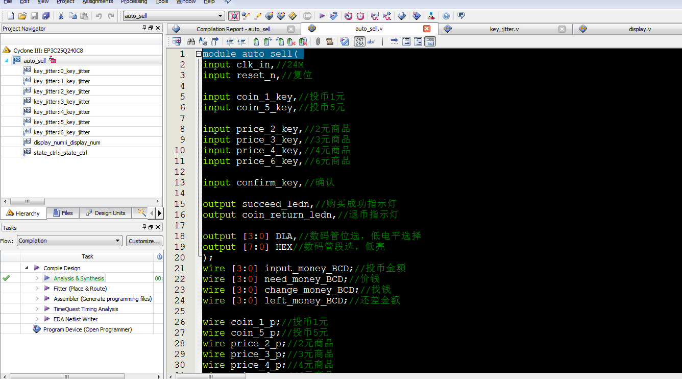 名称:自动售货机设计Verilog代码Quartus? 复旦开发板