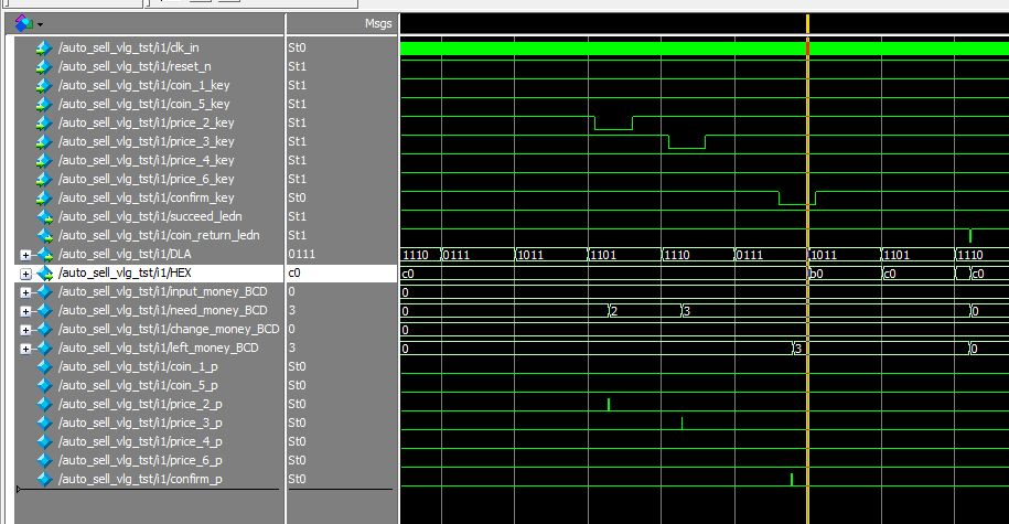 仿真选中3元商品,投币1元,再投币1元后,10s没有操作,还剩金额由1变为0,返回投币2元,退币指示灯coin_return_led亮。