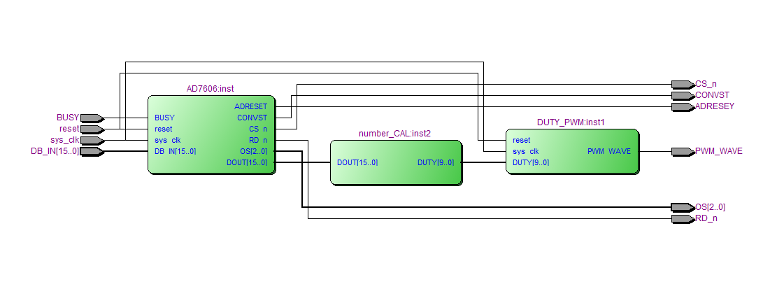 LIBRARY ieee; USE ieee.std_logic_1164.all; USE ieee.std_logic_unsigned.all; --AD7606模块 ENTITY AD7606 IS PORT ( sys_clk : IN STD_LOGIC;--时钟 reset : IN STD_LOGIC;--复位 RD_n : OUT STD_LOGIC;--AD引脚 CONVST : OUT STD_LOGIC;--AD引脚 ADRESET : OUT STD_LOGIC;--AD引脚 CS_n : OUT STD_LOGIC;--AD引脚 BUSY : IN STD_LOGIC;--AD引脚 DB_IN : IN STD_LOGIC_VECTOR(15 DOWNTO 0);--AD值引脚 OS : OUT STD_LOGIC_VECTOR(2 DOWNTO 0);--AD引脚 DOUT : OUT STD_LOGIC_VECTOR(15 DOWNTO 0)--采样值 ); END AD7606; ARCHITECTURE RTL OF AD7606 IS SIGNAL AD_state: STD_LOGIC_VECTOR(2 DOWNTO 0); SIGNAL div_count : STD_LOGIC_VECTOR(7 DOWNTO 0); SIGNAL CONVST_signal : STD_LOGIC; SIGNAL read_en : STD_LOGIC; SIGNAL RD_END : STD_LOGIC; SIGNAL count : STD_LOGIC_VECTOR(1 DOWNTO 0); SIGNAL VIM_CNT : STD_LOGIC_VECTOR(2 DOWNTO 0); BEGIN OS <= "000"; ADRESET <= NOT reset ; --AD状态控制 PROCESS (sys_clk, reset) BEGIN IF (reset = '0') THEN AD_state <= "000"; div_count <= "00000000"; ELSIF (sys_clk'EVENT AND sys_clk = '1') THEN CASE AD_state IS WHEN "000" => IF (div_count = "01100100") THEN div_count <= "00000000";--计数到100 ELSE div_count <= div_count + "00000001"; END IF; IF (div_count = "01100100") THEN---控制采样率,为系统时钟的100分频 AD_state <= "001"; END IF; WHEN "001" => IF (CONVST_signal = '1') THEN--检测CONVST AD_state <= "010"; END IF; WHEN "010" => IF (BUSY= '0') THEN AD_state <= "011";--检测BUSY END IF; WHEN "011" =>--读数 AD_state <= "100"; WHEN "100" => IF (RD_END = '1') THEN--读完成 AD_state <= "000"; END IF; WHEN OTHERS => AD_state <= "000"; END CASE;