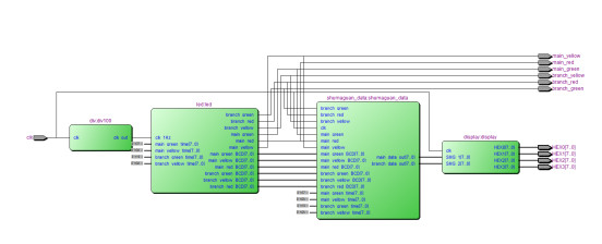 /* 红->绿?绿->黄?黄->红 1、红--计时main_red_times------------------------绿--计时main_green_times---main_yellow_times黄灯---------------红 2、绿--计时branch_green_times---branch_yellow_times黄灯--------------------红--计时branch_reg_times-------------------绿 */ module?traffic_light( input?clk,//50Mhz output?main_red,//主路灯 output?main_green,//主路灯 output?main_yellow,//主路灯 output?branch_red,//支路灯 output?branch_green,//支路灯 output?branch_yellow,//支路灯 output?[7:0]?HEX0,//(主干道)数码管0 output?[7:0]?HEX1,//(主干道)数码管1 output?[7:0]?HEX2,//(支干道)数码管2 output?[7:0]?HEX3//(支干道)数码管3 ); ?wire?clk_1Hz; ?wire?[7:0]?main_green_BCD; ?wire?[7:0]?main_yellow_BCD; ?wire?[7:0]?main_red_BCD; ?wire?[7:0]?branch_green_BCD; ?wire?[7:0]?branch_yellow_BCD; ?wire?[7:0]?branch_red_BCD; ?wire?[7:0]?main_data_out; ?wire?[7:0]?branch_data_out; ? wire?main_red_led;//主路灯 wire?main_green_led;//主路灯 wire?main_yellow_led;//主路灯 wire?branch_red_led;//支路灯 wire?branch_green_led;//支路灯 wire?branch_yellow_led;//支路灯 assign?main_red=main_red_led;//主路灯 assign?main_green=main_green_led;//主路灯 assign?main_yellow=main_yellow_led?;//主路灯 assign?branch_red=branch_red_led;//支路灯 assign?branch_green=branch_green_led;//支路灯 assign?branch_yellow=branch_yellow_led?;//支路灯