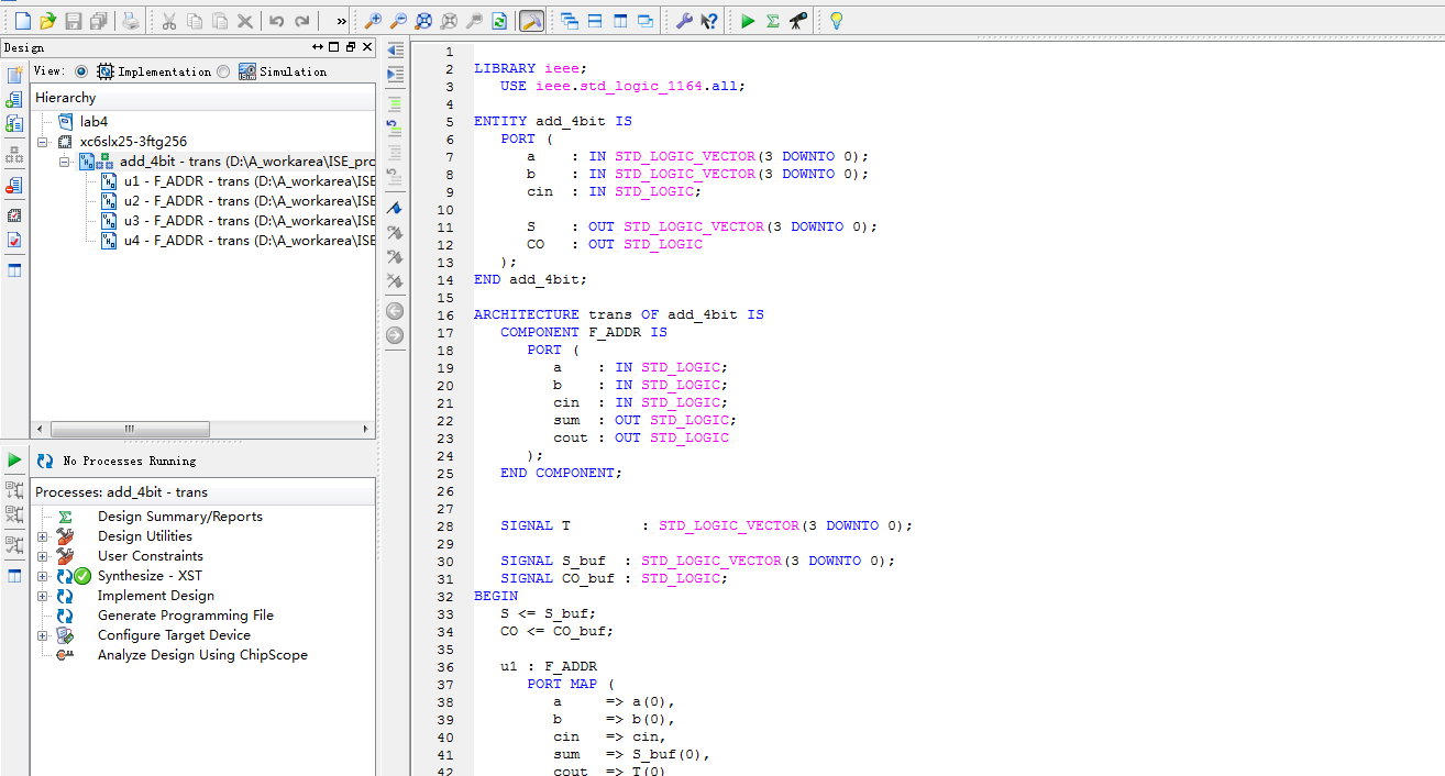 LIBRARY?ieee; ???USE?ieee.std_logic_1164.all; ENTITY?add_4bit?IS ???PORT?( ??????a????:?IN?STD_LOGIC_VECTOR(3?DOWNTO?0); ??????b????:?IN?STD_LOGIC_VECTOR(3?DOWNTO?0); ??????cin??:?IN?STD_LOGIC; ?????? ??????S????:?OUT?STD_LOGIC_VECTOR(3?DOWNTO?0); ??????CO???:?OUT?STD_LOGIC ???); END?add_4bit; ARCHITECTURE?trans?OF?add_4bit?IS ???COMPONENT?F_ADDR?IS ??????PORT?( ?????????a????:?IN?STD_LOGIC; ?????????b????:?IN?STD_LOGIC; ?????????cin??:?IN?STD_LOGIC; ?????????sum??:?OUT?STD_LOGIC; ?????????cout?:?OUT?STD_LOGIC ??????); ???END?COMPONENT; ??? ??? ???SIGNAL?T????????:?STD_LOGIC_VECTOR(3?DOWNTO?0); ???SIGNAL?S_buf??:?STD_LOGIC_VECTOR(3?DOWNTO?0); ???SIGNAL?CO_buf?:?STD_LOGIC; BEGIN ???S?<=?S_buf; ???CO?<=?CO_buf; ??? ???u1?:?F_ADDR ??????PORT?MAP?( ?????????a?????=>?a(0), ?????????b?????=>?b(0), ?????????cin???=>?cin, ?????????sum???=>?S_buf(0), ?????????cout??=>?T(0) ??????); ??? ??? ???u2?:?F_ADDR ??????PORT?MAP?( ?????????a?????=>?a(1), ?????????b?????=>?b(1), ?????????cin???=>?T(0), ?????????sum???=>?S_buf(1), ?????????cout??=>?T(1) ??????); ??? ??? ???u3?:?F_ADDR ??????PORT?MAP?( ?????????a?????=>?a(2), ?????????b?????=>?b(2), ?????????cin???=>?T(1), ?????????sum???=>?S_buf(2), ?????????cout??=>?T(2) ??????);