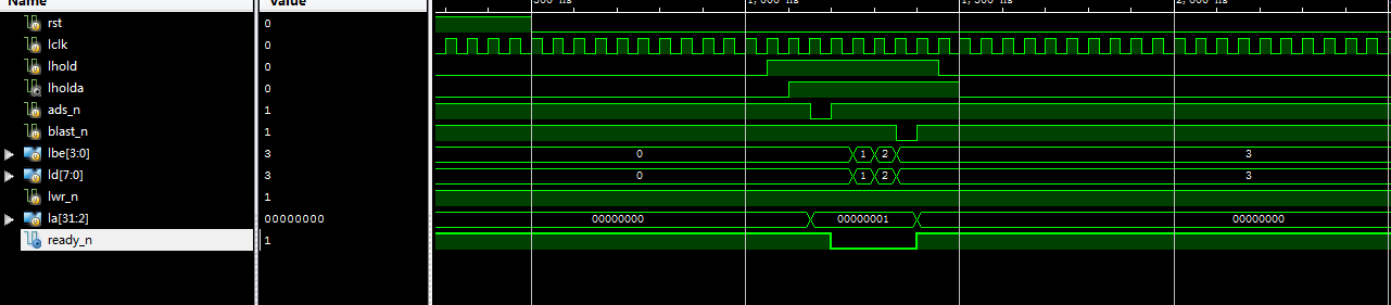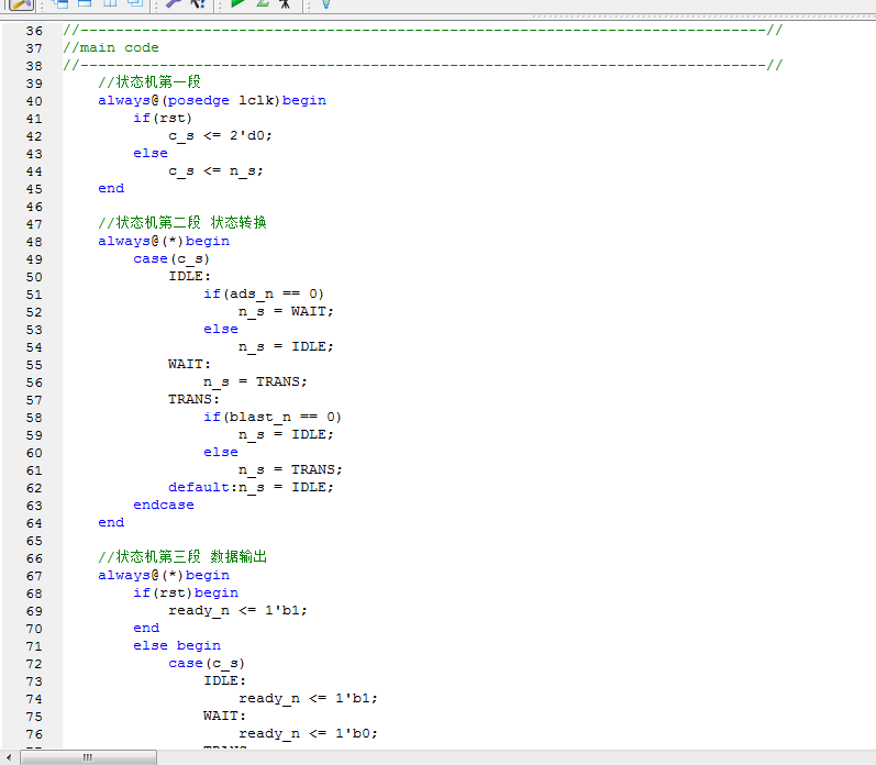 `timescale?1ns?/?1ps module?pci9054_lbus( ????input???????????????rst, ????input???????????????lclk, ???? ????input???????????????lhold, ????output?reg??????????lholda, ????input???????????????ads_n, ????input???????????????blast_n, ????output?reg??????????ready_n, ???? ????input?????[3:0]?????lbe, ????input?????[7:0]?????ld, ????input???????????????lwr_n, ????input?????[31:2]????la ????); //------------------------------------------------------------------------------// //parameter //------------------------------------------------------------------------------// ????parameter???[1:0]???????IDLE????????=?2'd0,//空闲状态 ????????????????????????????WAIT????????=?2'd1,//等待状态 ????????????????????????????TRANS???????=?2'd2;//数据传输 ???????????????????????????? //------------------------------------------------------------------------------// //wire //------------------------------------------------------------------------------// //------------------------------------------------------------------------------// //reg //------------------------------------------------------------------------------// ????reg?????[1:0]???????c_s?=?2'd0?,n_s?=?2'd0; //------------------------------------------------------------------------------// //main?code //------------------------------------------------------------------------------// ????//状态机第一段 ????always@(posedge?lclk)begin ????????if(rst) ????????????c_s?<=?2'd0; ????????else ????????????c_s?<=?n_s; ????end ???? ????//状态机第二段?状态转换 ????always@(*)begin ????????case(c_s) ????????????IDLE: ????????????????if(ads_n?==?0)??? ????????????????????n_s?=?WAIT; ????????????????else ????????????????????n_s?=?IDLE; ????????????WAIT: ????????????????n_s?=?TRANS; ????????????TRANS: ????????????????if(blast_n?==?0) ????????????????????n_s?=?IDLE; ????????????????else ????????????????????n_s?=?TRANS; ????????????default:n_s?=?IDLE; ????????endcase ????end