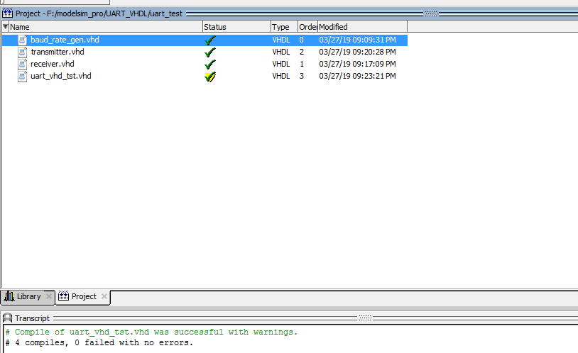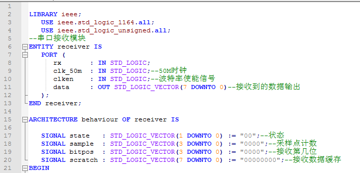 LIBRARY?ieee;??????????????????????????????????????????????? USE?ieee.std_logic_1164.all;???????????????????????????????? --testbench ENTITY?uart_vhd_tst?IS END?uart_vhd_tst; ARCHITECTURE?uart_arch?OF?uart_vhd_tst?IS --?constants????????????????????????????????????????????????? --?signals????? --例化波特率发生模块?????????????????????????????????????????????? ???COMPONENT?baud_rate_gen?IS ??????PORT?( ?????????clk_50m??:?IN?STD_LOGIC; ?????????rxclk_en?:?OUT?STD_LOGIC; ?????????txclk_en?:?OUT?STD_LOGIC ??????); ???END?COMPONENT; ??? --例化接收模块??? ???COMPONENT?receiver?IS ??????PORT?( ?????????rx???????:?IN?STD_LOGIC; ?????????clk_50m??:?IN?STD_LOGIC; ?????????clken????:?IN?STD_LOGIC; ?????????data?????:?OUT?STD_LOGIC_VECTOR(7?DOWNTO?0) ??????); ???END?COMPONENT; --例化发送模块??? ???COMPONENT?transmitter?IS ??????PORT?( ?????????din??????:?IN?STD_LOGIC_VECTOR(7?DOWNTO?0); ?????????wr_en????:?IN?STD_LOGIC; ?????????clk_50m??:?IN?STD_LOGIC; ?????????clken????:?IN?STD_LOGIC; ?????????tx???????:?OUT?STD_LOGIC ??????); ???END?COMPONENT;