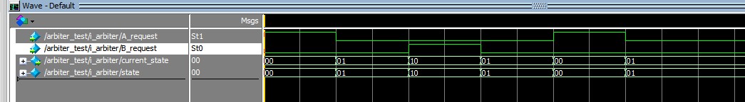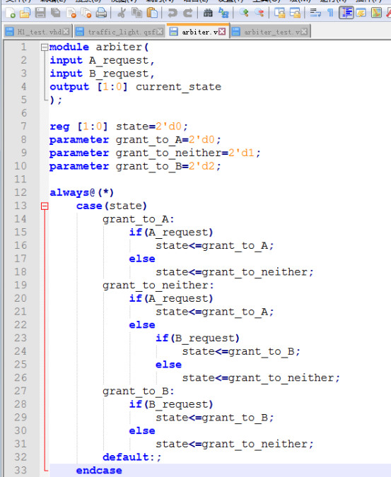 module?arbiter( input?A_request, input?B_request, output?[1:0]?current_state ); reg?[1:0]?state=2'd0; parameter?grant_to_A=2'd0; parameter?grant_to_neither=2'd1; parameter?grant_to_B=2'd2; always@(*) case(state) grant_to_A: if(A_request) state<=grant_to_A; else state<=grant_to_neither; grant_to_neither: if(A_request) state<=grant_to_A; else if(B_request) state<=grant_to_B; else state<=grant_to_neither; grant_to_B: if(B_request) state<=grant_to_B; else state<=grant_to_neither; default:; endcase