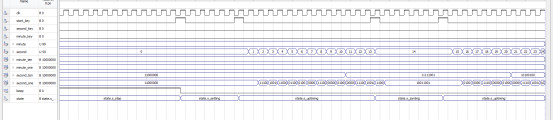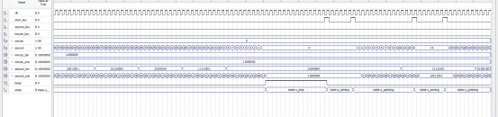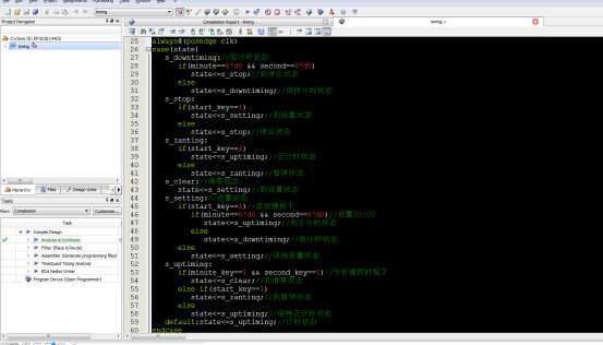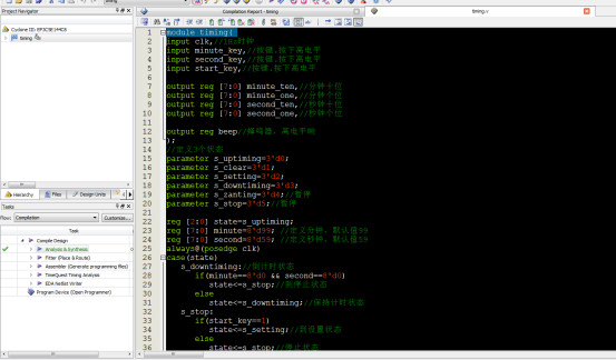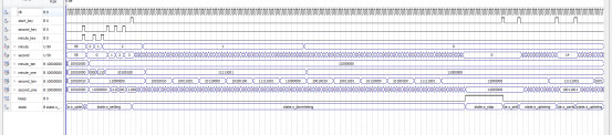 module?timing( input?clk,//1Hz时钟 input?minute_key,//按键.按下高电平 input?second_key,//按键.按下高电平 input?start_key,//按键.按下高电平 output?reg?[7:0]?minute_ten,//分钟十位 output?reg?[7:0]?minute_one,//分钟个位 output?reg?[7:0]?second_ten,//秒钟十位 output?reg?[7:0]?second_one,//秒钟个位 output?reg?beep//蜂鸣器,高电平响 ); //定义3个状态 parameter?s_uptiming=3'd0; parameter?s_clear=3'd1; parameter?s_setting=3'd2; parameter?s_downtiming=3'd3; parameter?s_zanting=3'd4;//暂停 parameter?s_stop=3'd5;//暂停 reg?[2:0]?state=s_uptiming; reg?[7:0]?minute=8'd99;//定义分钟,默认值99 reg?[7:0]?second=8'd59;//定义秒钟,默认值59 reg?[7:0]?minute_y=8'd99;//前设置值 reg?[7:0]?second_y=8'd59;//前设置值 always@(posedge?clk) case(state) s_downtiming://倒计时状态 if(minute==8'd0?&&?second==8'd0) state<=s_stop;//到停止状态 else state<=s_downtiming;//保持计时状态 s_stop: if(start_key==1) state<=s_setting;//到设置状态 else state<=s_stop;//停止状态 s_zanting: if(start_key==1) state<=s_uptiming;//正计时状态 else state<=s_zanting;//暂停状态 s_clear://清零状态 state<=s_setting;//到设置状态 s_setting://设置状态 if(start_key==1)//启动键按下 if(minute==8'd0?&&?second==8'd0)//设置00:00 state<=s_uptiming;//到正计时状态 else state<=s_downtiming;//倒计时状态 else state<=s_setting;//保持设置状态 s_uptiming: if(minute_key==1?&&?second_key==1)//分秒键同时按下 state<=s_clear;//到清零状态 else?if(start_key==1) state<=s_zanting;//到暂停状态 else state<=s_uptiming;//保持正计时状态 default:state<=s_uptiming;//计时状态 endcase