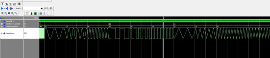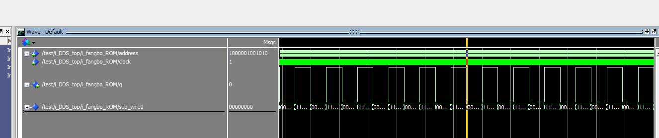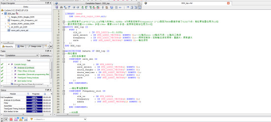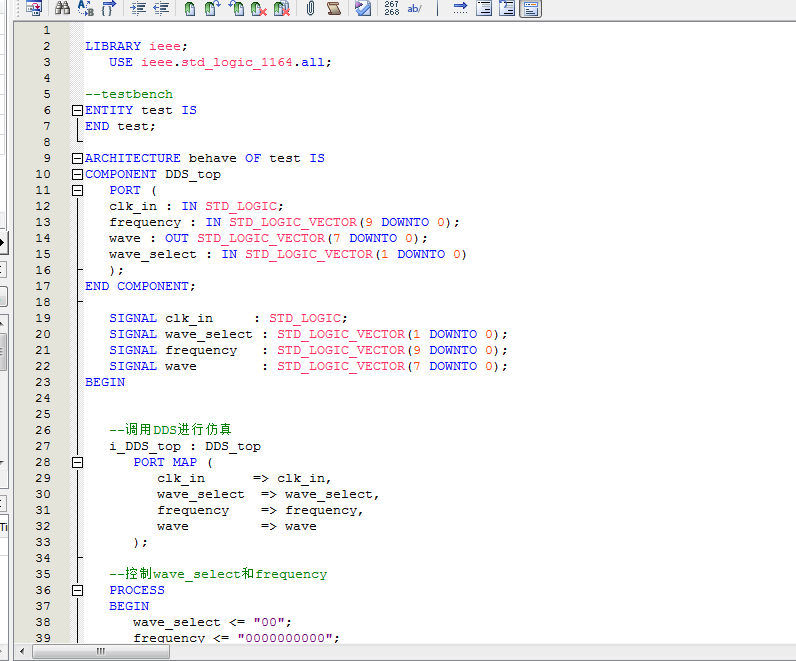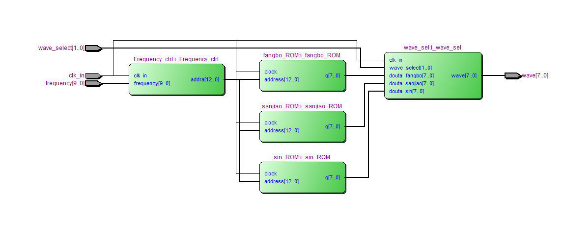 LIBRARY?ieee; ???USE?ieee.std_logic_1164.all; --DDS频率等于clk*N/2^13,clk为输入时钟81.92KHz,N为频率控制字frequency;2^13是因为ROM里面存储了8192个点,相位累加器位宽为13位 --要求频率范围10~10KHz,步进10Hz,需要1000个步进,故频率控制字位宽为10位 ENTITY?DDS_top?IS ???PORT?( ??????clk_in??????:?IN?STD_LOGIC;--81.92KHz ??????wave_select??:?IN?STD_LOGIC_VECTOR(1?DOWNTO?0);--01输出sin,10输出方波,11输出三角波 ??????frequency????:?IN?STD_LOGIC_VECTOR(9?DOWNTO?0);--频率控制字,控制输出波形频率,值越大,频率越大 ??????wave?????????:?OUT?STD_LOGIC_VECTOR(7?DOWNTO?0)--输出波形 ???); END?DDS_top; ARCHITECTURE?behave?OF?DDS_top?IS --例化模块 --波形选择模块 ???COMPONENT?wave_sel?IS ??????PORT?( ?????????clk_in??????:?IN?STD_LOGIC; ?????????wave_select??:?IN?STD_LOGIC_VECTOR(1?DOWNTO?0); ?????????douta_fangbo?:?IN?STD_LOGIC_VECTOR(7?DOWNTO?0); ?????????douta_sanjiao?:?IN?STD_LOGIC_VECTOR(7?DOWNTO?0); ?????????douta_sin????:?IN?STD_LOGIC_VECTOR(7?DOWNTO?0); ?????????wave?????????:?OUT?STD_LOGIC_VECTOR(7?DOWNTO?0) ??????); ???END?COMPONENT; ??? --相位累加器模块 ???COMPONENT?Frequency_ctrl?IS ??????PORT?( ?????????clk_in??????:?IN?STD_LOGIC; ?????????frequency????:?IN?STD_LOGIC_VECTOR(9?DOWNTO?0); ?????????addra????????:?OUT?STD_LOGIC_VECTOR(12?DOWNTO?0) ??????); ???END?COMPONENT;