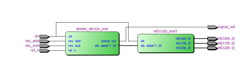 LIBRARY?ieee; USE?ieee.std_logic_1164.all;? LIBRARY?work; ENTITY?divider?IS? PORT ( clk?:??IN??STD_LOGIC;--时钟输入 rst_n?:??IN??STD_LOGIC;--复位 key_add?:??IN??STD_LOGIC;--加按键 key_sub?:??IN??STD_LOGIC;--减按键 signal_out?:??OUT??STD_LOGIC;--频率信号输出 HEX0?:??OUT??STD_LOGIC_VECTOR(6?DOWNTO?0);--数码管 HEX1?:??OUT??STD_LOGIC_VECTOR(6?DOWNTO?0);--数码管 HEX2?:??OUT??STD_LOGIC_VECTOR(6?DOWNTO?0)--数码管 ); END?divider; ARCHITECTURE?bdf_type?OF?divider?IS? COMPONENT?divider_ctrl PORT(clk?:?IN?STD_LOGIC; ?rst_n?:?IN?STD_LOGIC; ?key_add?:?IN?STD_LOGIC; ?key_sub?:?IN?STD_LOGIC; ?signal_out?:?OUT?STD_LOGIC; ?dis_data?:?OUT?STD_LOGIC_VECTOR(11?DOWNTO?0) ); END?COMPONENT; COMPONENT?hex PORT(clk?:?IN?STD_LOGIC; ?dis_data?:?IN?STD_LOGIC_VECTOR(11?DOWNTO?0); ?HEX0?:?OUT?STD_LOGIC_VECTOR(6?DOWNTO?0); ?HEX1?:?OUT?STD_LOGIC_VECTOR(6?DOWNTO?0); ?HEX2?:?OUT?STD_LOGIC_VECTOR(6?DOWNTO?0) ); END?COMPONENT; SIGNALsignal_temp?:??STD_LOGIC_VECTOR(11?DOWNTO?0); BEGIN? b2v_inst?:?divider_ctrl PORT?MAP(clk?=>?clk, ?rst_n?=>?rst_n, ?key_add?=>?key_add, ?key_sub?=>?key_sub, ?signal_out?=>?signal_out, ?dis_data?=>?signal_temp);