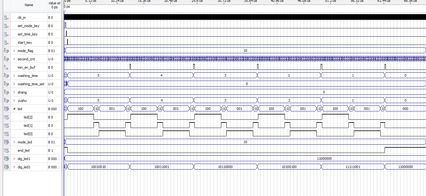 轻柔洗涤,电机led[2:0]表示,正转25s,暂停5s,反转25s,暂停5s。倒计时结束后end_led拉高提示。