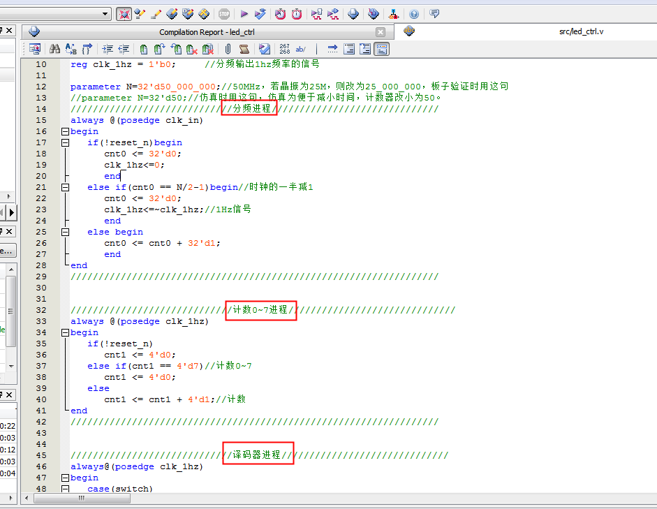 module?led_ctrl( input?clk_in,//系统时钟 input?reset_n,//低电平有效的复位信号--key0 input?[1:0]switch,//拨码开关--key1~2 output?reg[7:0]led//流水灯的输出 ); reg?[31:0]cnt0?=?32'd0; reg?[3?:0]cnt1?=?4'd0; reg?clk_1hz?=?1'b0;//分频输出1hz频率的信号 parameter?N=32'd50_000_000;//50MHz,若晶振为25M,则改为25_000_000,板子验证时用这句 //parameter?N=32'd50;//仿真时用这句,仿真为便于减小时间,计数器改小为50。 /////////////////////////////分频进程////////////////////////////// always?@(posedge?clk_in) begin if(!reset_n)begin cnt0?<=?32'd0; clk_1hz<=0; end else?if(cnt0?==?N/2-1)begin//时钟的一半减1 cnt0?<=?32'd0; clk_1hz<=~clk_1hz;//1Hz信号 end else?begin cnt0?<=?cnt0?+?32'd1; end end ////////////////////////////////////////////////////////////////// /////////////////////////////计数0~7进程////////////////////////////// always?@(posedge?clk_1hz) begin if(!reset_n) cnt1?<=?4'd0; else?if(cnt1?==?4'd7)//计数0~7 cnt1?<=?4'd0; else cnt1?<=?cnt1?+?4'd1;//计数 end