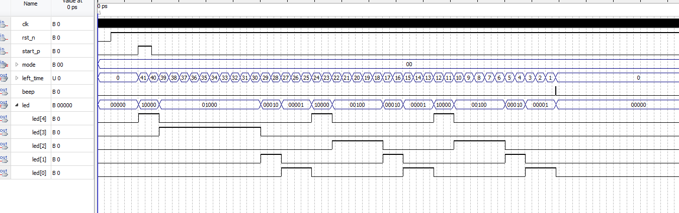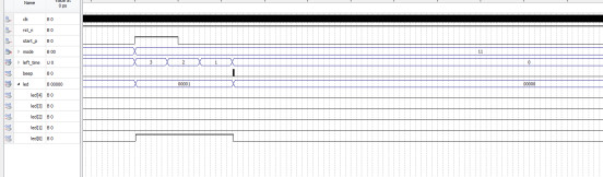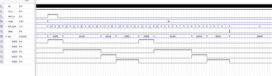 上图为甩干模式,图中mode信号为11,表示甩干模式。Start_p信号开始后,left_time显示3分钟,从3开始倒计时,直接进入甩干的步骤,甩干3分钟,结束后蜂鸣器响3声。