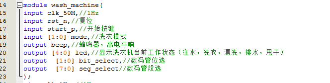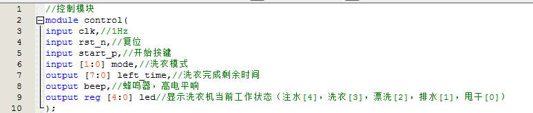 控制模块为核心处理模块,图中start_p为开始按键,mode为洗衣模式设置信号,left_time为洗衣完成剩余时间,beep表示蜂鸣器,led表示洗衣机当前个状态,led[4]表示注水,led[3]表示洗衣,led[2]表示漂洗,led[1]表示排水,led[0]表示甩干。
