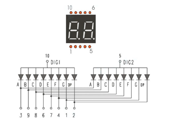 显示模块显示剩余时间,使用2位数码管显示,数码管为共阳极数码管,当数码管的段选信号为低电平时,对应的段亮。两位数码管,其内部连接如下图。