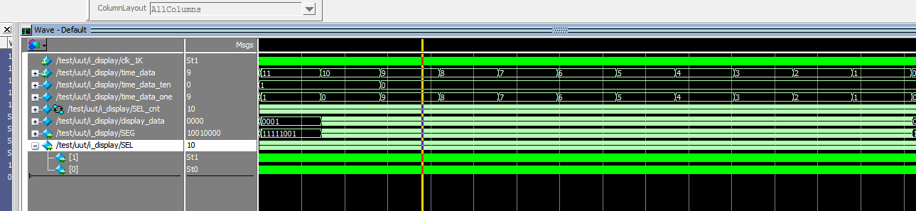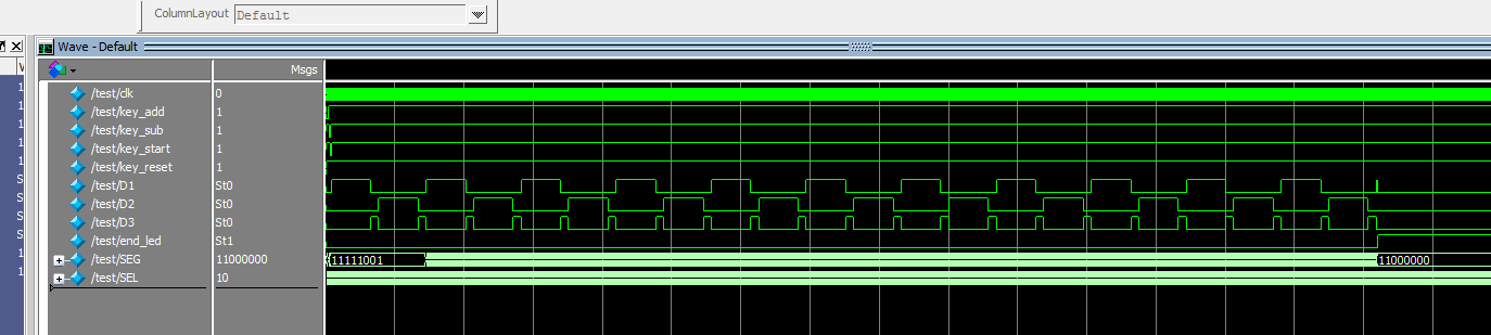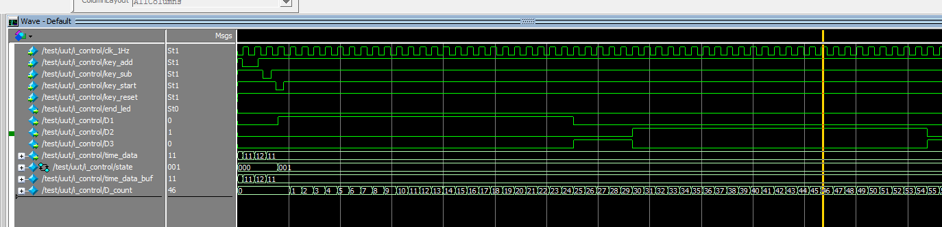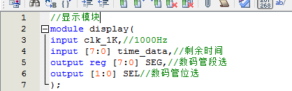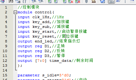 //控制模块 module?control( input?clk_1Hz,//1Hz input?key_add,//加按键 input?key_sub,//减按键 input?key_start,//启动暂停按键 input?key_reset,//复位按键 output?end_led,//结束指示灯 output?reg?D1,//正转 output?reg?D2,//反转 output?reg?D3,//暂停 output?[7:0]?time_data//剩余时间 ); parameter?s_idle=3'd0; parameter?s_start=3'd1;//启动 parameter?s_suspend=3'd2;//暂停 parameter?s_end=3'd3;//停止 reg?[2:0]?state=s_idle; reg?[7:0]?time_data_buf=8'd10;//剩余时间 always@(posedge?clk_1Hz?or?negedge?key_reset) if(~key_reset)//复位按键,按下高电平 state<=s_idle; else case(state)//空闲,设置定时时间 s_idle: if(key_start==0)//启动 state<=s_start;//启动 else state<=s_idle; s_start: if(key_start==0)//暂停 state<=s_suspend;//暂停 else?if(time_data_buf==8'd0)//计时结束 state<=s_end; else state<=s_start; s_suspend: if(key_start==0)//启动 state<=s_start;//启动 else state<=s_suspend; s_end: state<=s_end; default:; endcase reg?[7:0]?D_count=8'd0; always@(posedge?clk_1Hz) case(state)//空闲,设置定时时间 s_idle: //显示设置时间 if(key_add==0)//加按键,按下高电平 time_data_buf<=time_data_buf+8'd1; else?if(key_sub==0)//减按键 if(time_data_buf==8'd0) time_data_buf<=8'd0; else time_data_buf<=time_data_buf-8'd1; s_start: if(time_data_buf==8'd0) time_data_buf<=8'd0; else if(D_count==8'd59) time_data_buf<=time_data_buf-8'd1;//倒计时 s_end: time_data_buf<=8'h0;//显示0 default:; endcase always@(posedge?clk_1Hz?or?negedge?key_reset) if(~key_reset) D_count<=8'd0; else if(state==s_start) if(D_count==8'd59) D_count<=8'd0; else D_count<=D_count+8'd1;//计数0~59 else D_count<=D_count; always@(*) if(state==s_start) if(D_count<8'd25)//25s,0~24 D1<=1;//正转 else D1<=0; else D1<=0; always@(*) if(state==s_start) if((D_count>=8'd25?&&?D_count<=8'd29)||(D_count>=8'd55?&&?D_count<=8'd59)) D3<=1;//暂停 else D3<=0; else D3<=0; always@(*) if(state==s_start) if(D_count<=8'd54?&&?D_count>=8'd30)//30~54 D2<=1;//反转 else D2<=0; else