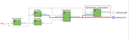 module?ASK( input?clk, output?[7:0]dataout, output?demodul_data//解调信号 ); wire?clkout; wire?out; wire?[7:0]sin; choose?inst1( .clk(clk), .data_in(sin), .sel(out), .data_out(dataout) ); clk_div?inst2( .clk(clk), .clk_out(clkout) ); MXL?inst3( .clk(clkout), .out(out) ); nco?inst4( .clk(clk), .sin(sin) ); //解调模块 demodulation?i_demodulation( .?clk(clk),//时钟 .?dataout(dataout),//2ASK信号 .?demodul_data(demodul_data)//解调信号 ); endmodule