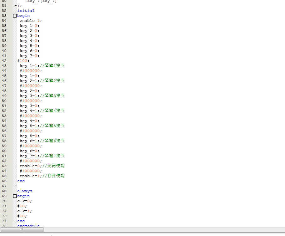 //电子琴设计 module?electronic_organ( input?clk,//1MHz input?enable,//高电平输出,低电平不输出 input?key_1,//按键1 input?key_2,//按键2 input?key_3,//按键3 input?key_4,//按键4 input?key_5,//按键5 input?key_6,//按键6 input?key_7,//按键7 output?SPEAKER,//音频输出 output?reg?[7:0]?HEX//数码管 ); parameter?div_1=12'd2272;//音阶1对应分频值--440Hz parameter?div_2=12'd2024;//音阶2对应分频值--493.9Hz parameter?div_3=12'd1803;//音阶3对应分频值--554.37Hz parameter?div_4=12'd1702;//音阶4对应分频值--587.33Hz parameter?div_5=12'd1516;//音阶5对应分频值--659.33Hz parameter?div_6=12'd1351;//音阶6对应分频值--739.99Hz parameter?div_7=12'd1203;//音阶7对应分频值--830.61Hz //分频 reg?[11:0]?div_num=12'd0;//分频值 reg?[3:0]?display_num=4'd0;//数码管显示值 always@(posedge?clk) if(key_1==1)//按键1按下 div_num<=div_1;//音阶1对应分频值 else?if(key_2==1)//按键2按下 div_num<=div_2;//音阶2对应分频值 else?if(key_3==1)//按键3按下 div_num<=div_3;//音阶3对应分频值 else?if(key_4==1)//按键4按下 div_num<=div_4;//音阶4对应分频值 else?if(key_5==1)//按键5按下 div_num<=div_5;//音阶5对应分频值 else?if(key_6==1)//按键6按下 div_num<=div_6;//音阶6对应分频值 else?if(key_7==1)//按键7按下 div_num<=div_7;//音阶7对应分频值 else div_num<=12'd0; //分频 reg?[11:0]?div_cnt=12'd0;//分频计数器 always@(posedge?clk) if(div_cnt>=div_num)//计数最大值后回零 div_cnt<=12'd0; else div_cnt<=div_cnt+12'd1;//计数 reg?beep=0;//频率信号 always@(posedge?clk) if(div_cnt<=div_num/2)//计数最大值后回零 beep<=0;//音频输出 else beep<=1;//音频输出