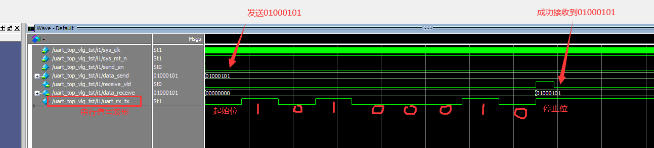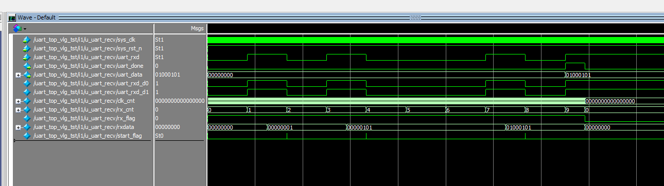 2.按照与发送端一致的协议和波特率、相同频率的时钟源,将接收到的数据转换成8位并实行数据。设计UART接收端电路,并仿真验证电路功能;