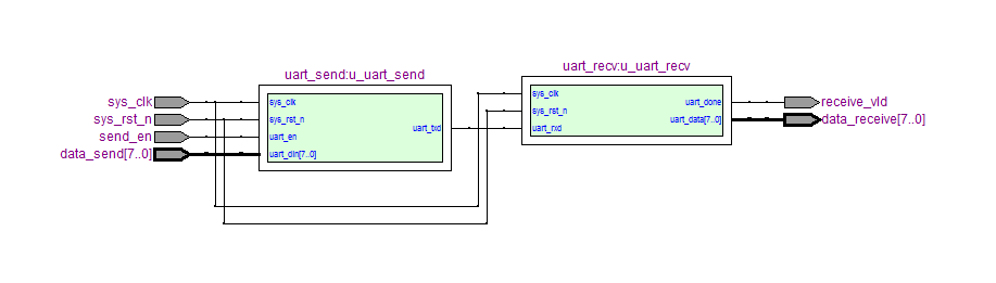 //UART顶层模块 //波特率2400,1位起始位,8位数据位,1位停止位 //将发送模块的串行输出接到接收模块的串行输入上 //验证接收数据是否等于输入数据 module?uart_top( ????input???????????sys_clk,??????????//外部50M时钟 ????input???????????sys_rst_n,????????//外部复位信号,低有效 ?input??????????send_en,????????//发送使能 ?input??????????[7:0]?data_send,???//发送数据? ?output?????????receive_vld,?//接收数据有效指示 ?output?[7:0]?data_receive?//接收数据 ????); ???? //wire?define??? wire?uart_rx_tx;//将发送模块的串行输出接到接收模块的串行输入上 //UART接收模块????? uart_recv?u_uart_recv(????????????????? ????.sys_clk????????(sys_clk),//外部50M时钟? ????.sys_rst_n??????(sys_rst_n),//外部复位信号,低有效 ????.uart_rxd???????(uart_rx_tx),//UART接收端口 ????.uart_done??????(receive_vld),//接收数据有效指示 ????.uart_data??????(data_receive)//接收数据LED显示 ????); ? //UART发送模块???? uart_send?u_uart_send(????????????????? ????.sys_clk????????(sys_clk),//外部50M时钟? ????.sys_rst_n??????(sys_rst_n),//外部复位信号,低有效 ????.uart_en????????(send_en),//发送按键 ????.uart_din???????(data_send),//发送数据 ????.uart_txd???????(uart_rx_tx)//UART发送端口 ????); endmodule