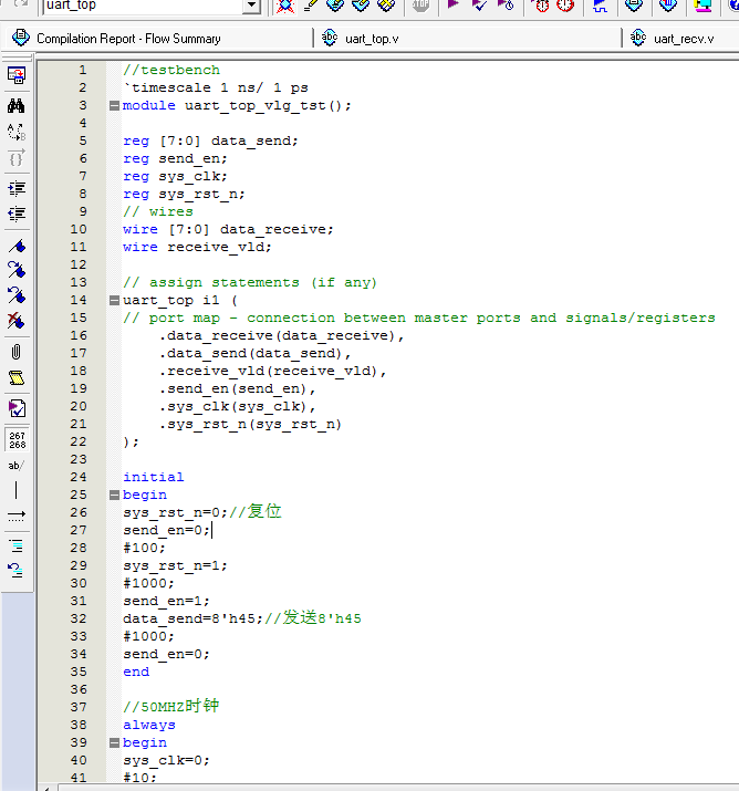 3.把1、2中设计的两个电路合并到一个可综合模块中,并仿照题目1中的M0模块编写该题目的测试模块,产生10组测试信号,以仿真验证所设计电路是否能正确发送,接收数据。