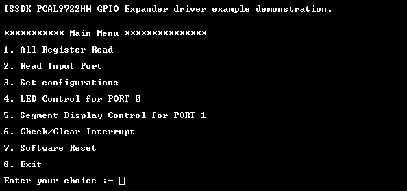 - 如果用户想要更改默认配置,则打开演示应用程序中的?“gpioexpander”?文件夹并选择?“pcal9722hnconfig.h”?文件并根据需要更改宏。
