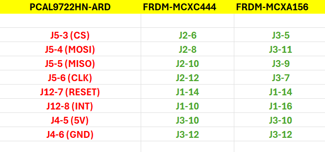 - PCAL9722HN 可以堆叠在 MCXA153 和 MCXN947 板上,对于 MCXC444 和 MCXA156,请参阅下面给出的移植指南:-