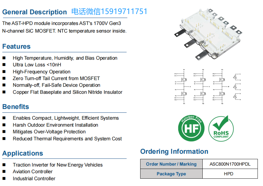 ASC800N1700HPDL三相全桥碳化硅模块1700V、封装长端子